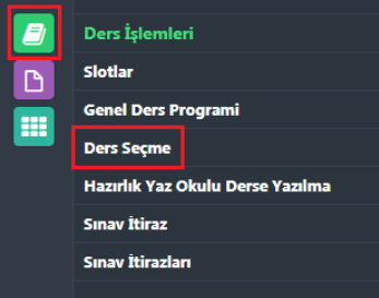 1- OİS’e kullanıcı adı ve parolanız ile giriş yaptıktan sonra sol alandaki “ders işlemleri” menüsünden “ders seçme” alanına erişebilirsiniz.