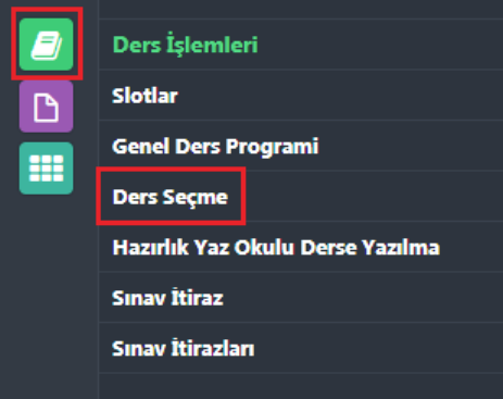 1.OİS’e kullanıcı adı ve parolanız ile giriş yaptıktan sonra sol alandaki “ders işlemleri” menüsünden “ders seçme” alanına erişebilirsiniz.