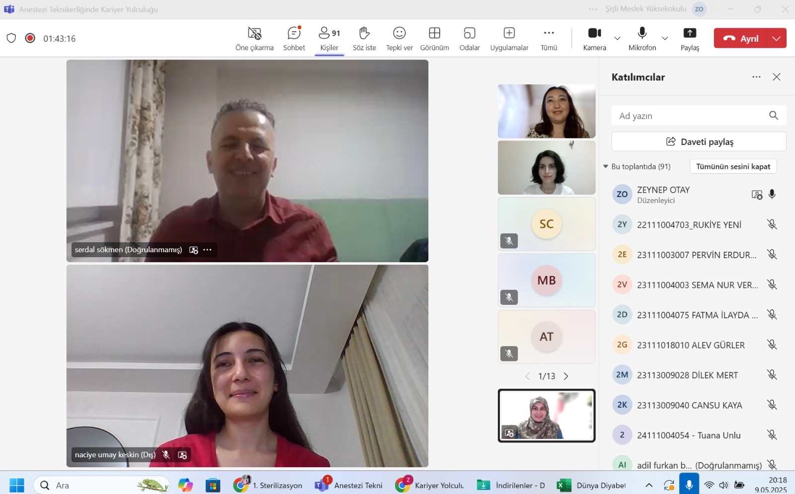 İstanbul Şişli Meslek Yüksekokulu Anestezi Programı, “Anestezi Teknikerliğinde Kariyer Yolculuğu” konulu söyleşi düzenledi. Çevrimiçi olarak gerçekleştirilen etkinlikte, Anestezi Teknikerleri Serdal Sökmen, Elif Begüm Çakmak ve Umay Keskin öğrencilerimizle bir araya geldi. Konuklarımız; anestezi teknikerliğinin görev ve sorumluluklarından başlayarak, bu alanda çalışan sağlık profesyonellerinin sahip olması gereken bilgi, beceri ve etik değerlere; mezuniyet sonrası karşılaşılabilecek mesleki zorluklara ve bu zorluklarla başa çıkma yöntemlerine; kamu ve özel sektördeki istihdam olanaklarına; ayrıca sürekli mesleki gelişim, sertifikasyon süreçleri ve uzmanlaşma imkânlarına kadar geniş bir yelpazede bilgi aktarımında bulundu. Öğrencilerimiz, hem mesleğe hazırlık süreçlerini daha bilinçli şekilde planlayabilme hem de kendi kariyer rotalarını çizerken faydalanabilecekleri değerli görüş ve deneyimlere doğrudan erişim sağlama fırsatı buldu.