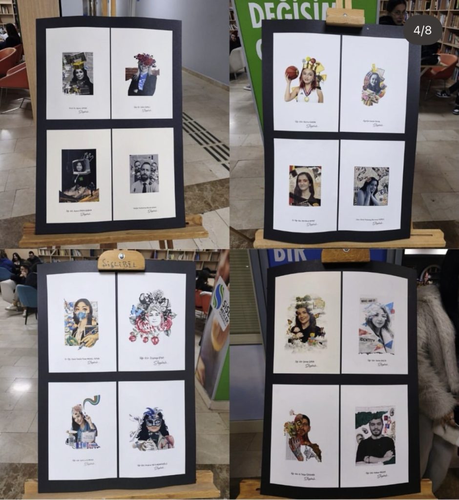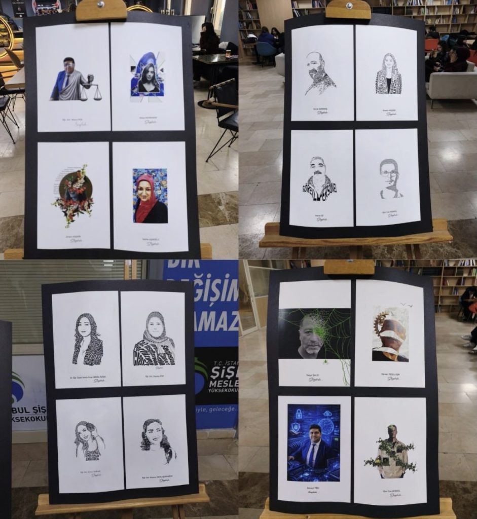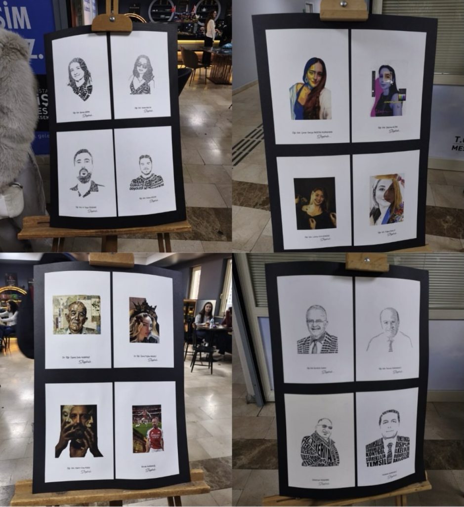 Sergide, öğrencilerimizin ürettiği “tipografik portre” ve “dijital kolaj” çalışmalarına yer verildi. Akademik ve idari personel fotoğraflarından yola çıkılarak hazırlanan bu eserler; öğrencilerin görsel anlatım gücünü, yaratıcılığını ve tasarım süreçlerindeki gelişimini etkileyici bir şekilde ortaya koydu.