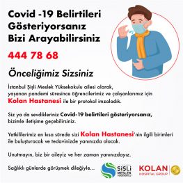 Covid - 19 Belirtileri Gösteriyorsanız Bizi Arayabilirsiniz 444 78 68  Önceliğimiz Sizsiniz İstanbul Şişli Meslek Yüksekokulu ailesi olarak, yaşanan pandemi süresince öğrencilerimiz ve çalışanlarımız için Kolan Hastanesi ile protokol imzaladık. Siz ya da sevdikleriniz Covid - 19 belirtileri gösteriyorsanız, bizimle iletişime geçebilirsiniz. Yetkililerimiz en kısa sürede sizi Kolan Hastanesi’nin ilgili