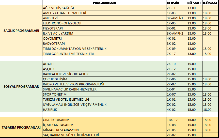 • I. Oturum, 09.10.2023 Pazartesi günü sağlık programları için saat 12.00’desosyal programlar ve tasarım programları için saat 14.00’te öğrencilerin katılımıyla konferans salonunda yapılacaktır. II. Öğretimler için sağlık, sosyal ve tasarım programları birlikte saat 17.00’de öğrencilerin katılımıyla konferans salonunda oryantasyon programı gerçekleştirilecektir.